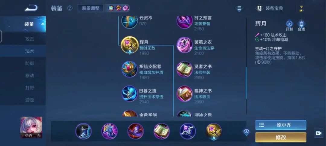 第四件装备我推荐出贤者之书,这件装备的价格太贵,但是提供的伤害非常可观。由于价格太贵,所以第四件出不会太卡装备格子,如果第五件第六件出就会占用太多的经济。第五件装备必不可少的是虚无法杖,最后一件装备选择辉月,有辉月在,能确保小乔在团战中打出大招。