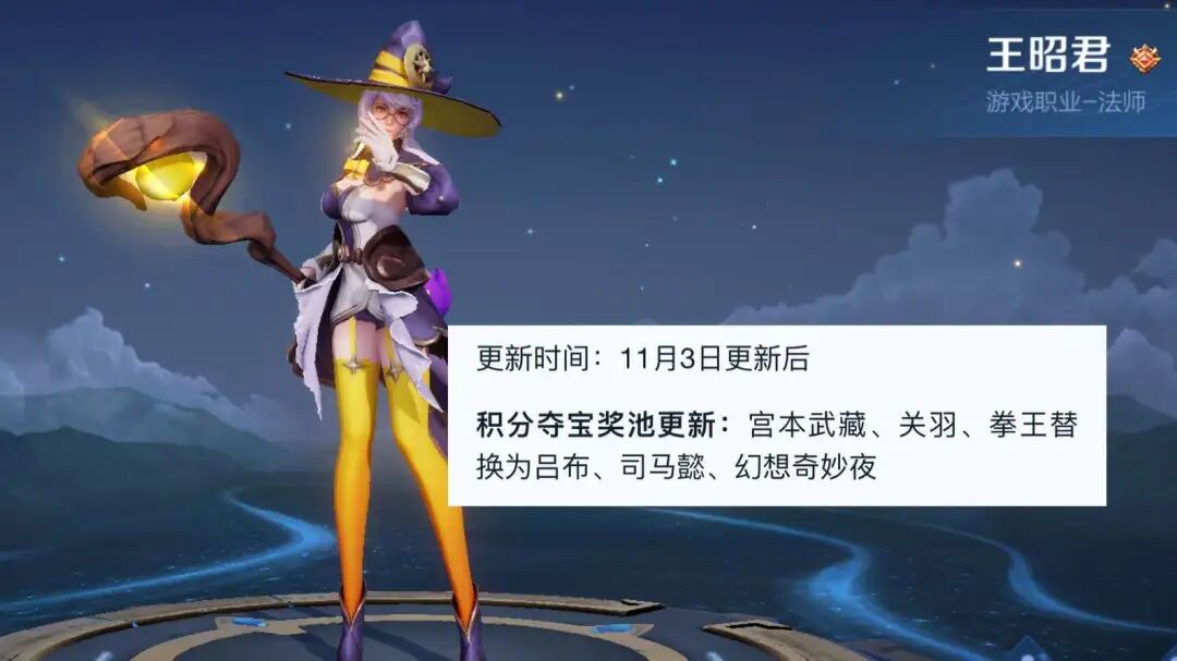 在3号更新的当天,积分夺宝奖池也迎来了更新,如下图所示,吕布、司马懿还有王昭君的幻想奇妙夜替代了原来的宫本武藏、关羽还有拳王。
