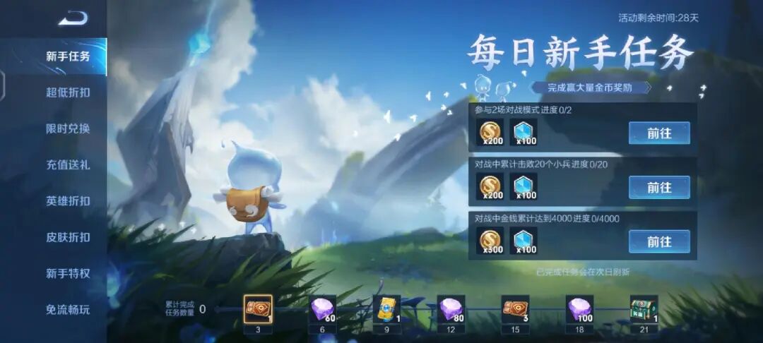 此外还有每日新手任务,完成任务可以胡德夫金币、铭文碎片还有钻石。另外为了照顾新手玩家的游戏体验,让新手玩家和老玩家在铭文方面处于同一起跑线,新手玩家完成新手任务还可以获得五级铭文体验。