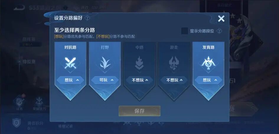 而分路匹配机制就很好的解决了这个问题。在匹配之前,玩家选择两个想玩分路,选择一个可玩分路,选择两个不想玩分路。