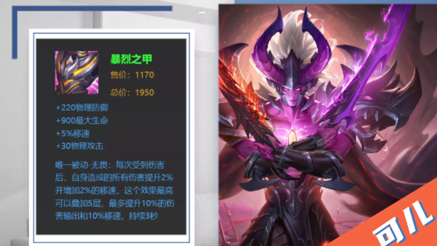 而这个版本,暴烈之甲成为了更好的选择。和反甲相比,暴烈之甲的物理防御低很多,但是它的优点在于有900点最大生命值。