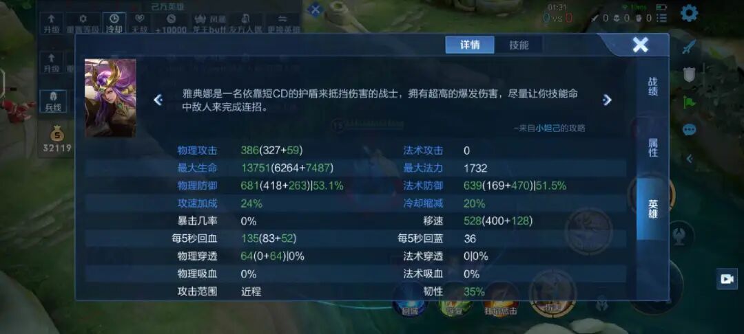 在打野刀满层的时候,这一套出装的雅典娜拥有13751点血量,完全已经超过了绝大多数坦克英雄的血量。物抗有681,法抗有639,相对来说物抗相对偏低。