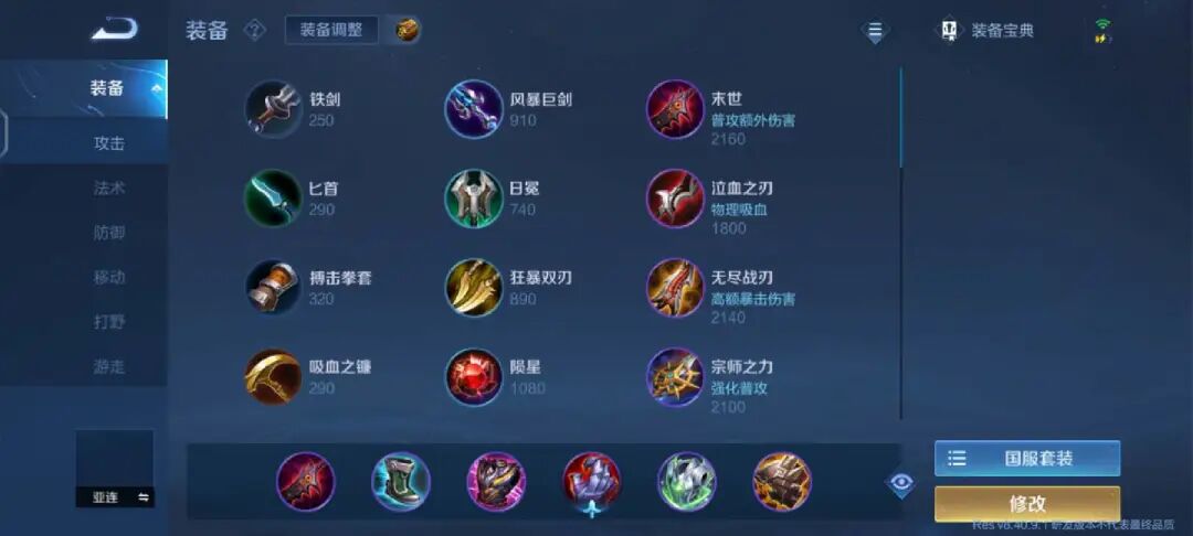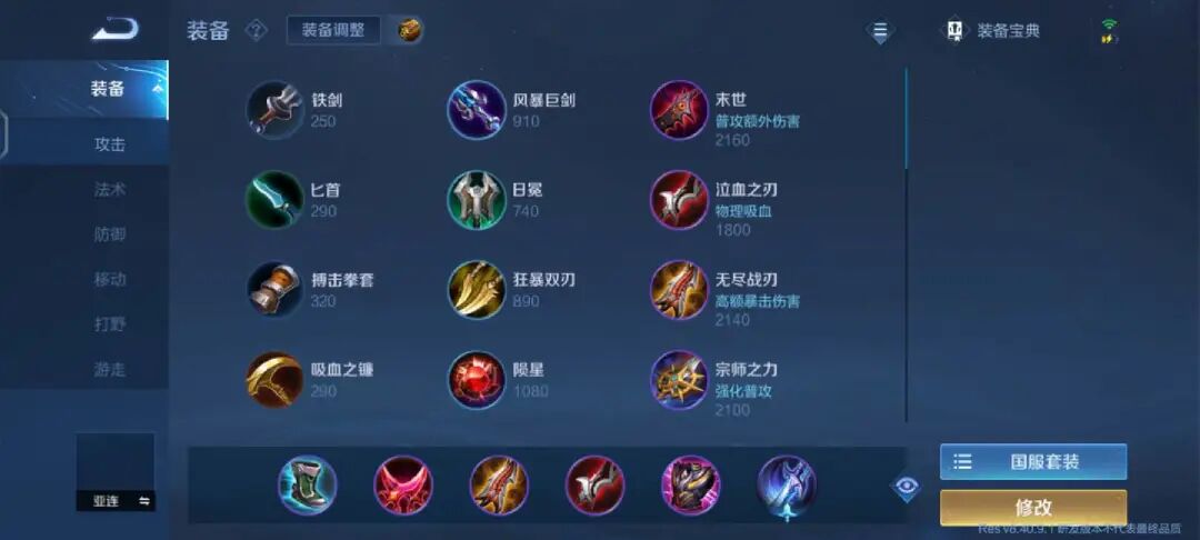 如果熟悉了亚连的技能,那么也可以选择出输出装备,影刃搭配无尽,在加上泣血之刃,防御装备只有一件暴烈之甲外加纯净苍穹的免伤。