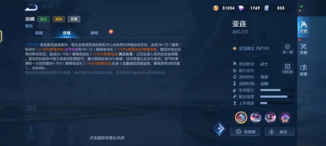 另外攻击和技能命中英雄的时候会积攒怒气,根据怒气最多提供44%物理穿透和魔法穿透,同时还有20%免伤。怒气满时还会给亚连回复生命值,血量越低回复的生命值越高。