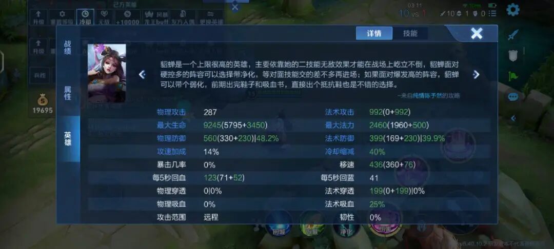 在做出破茧之衣、吸血书还有时之预言三件套之后,貂蝉就拥有了将近一万的生命值,500多的物抗和400的魔抗,换成抵抗鞋就是五百多的双抗,这个坦度已经相当于一个半肉坦克了,后续再出时之预言和帽子之类的输出装备,那么貂蝉就会变得伤害又高又肉,同时还有不低的法术穿透。