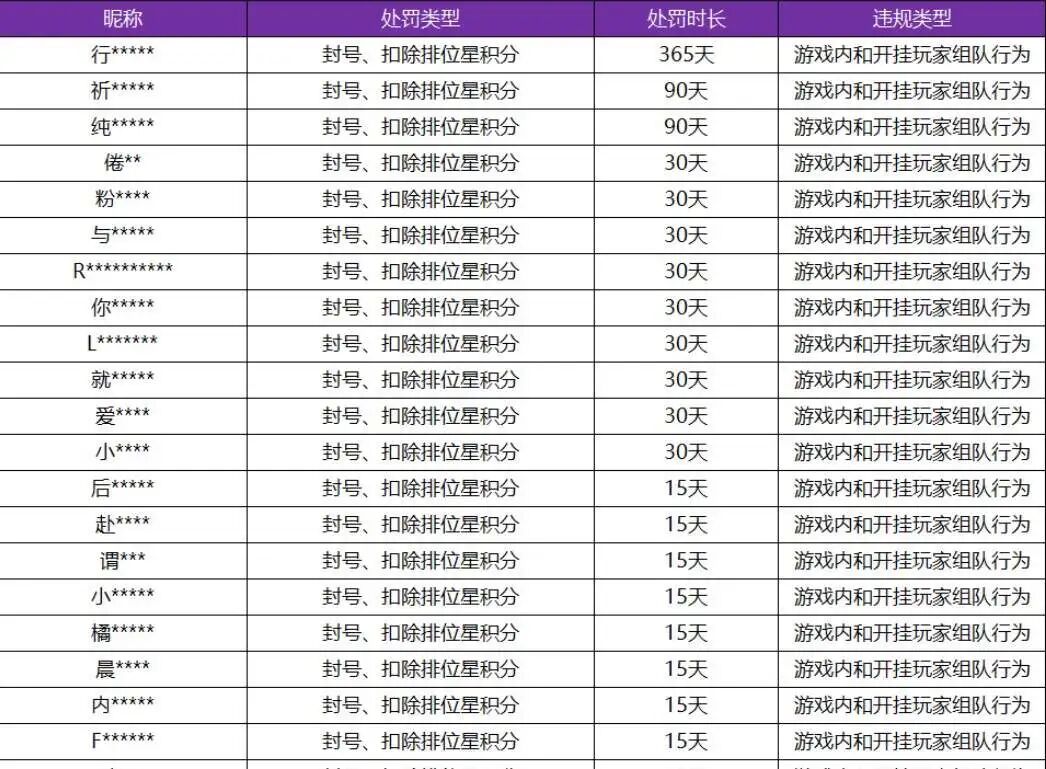 而和开挂玩家组队的玩家,也会得到封号一年到15天的惩罚,并且扣除排位星和巅峰赛积分。