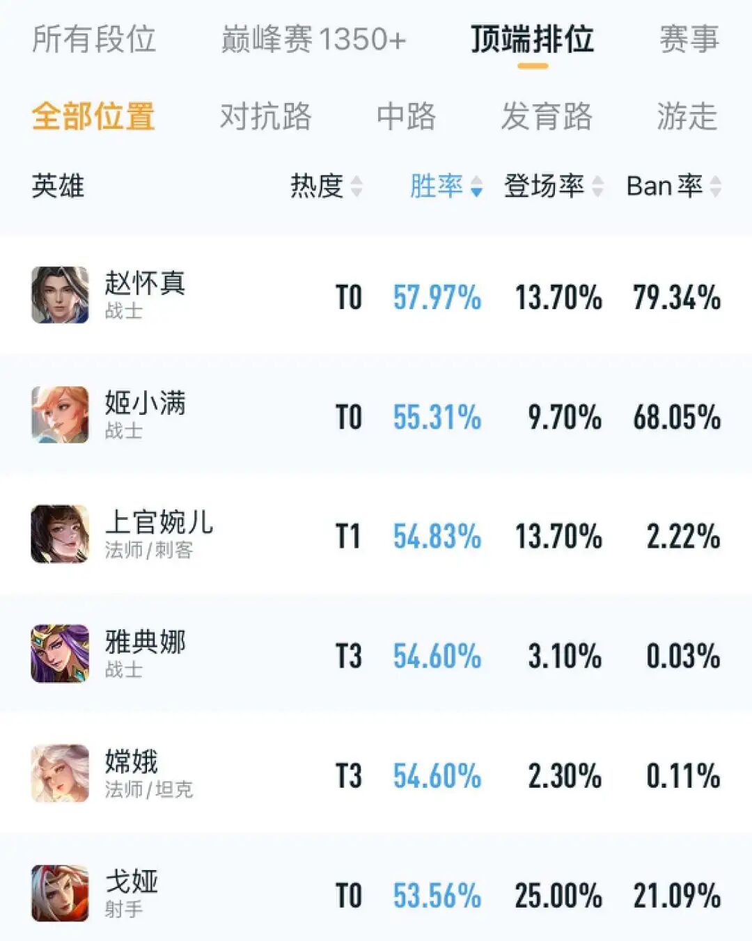 到目前为止,赵怀真在巅峰赛的禁用率和出场率加在一起已经超过了90%,接近100%的远取率,同时胜率也超过了58%,有幸成为了王者荣耀有史以来胜率最高的英雄之一。
