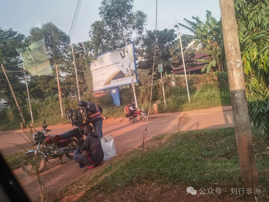 这个老哥每天演的是推着瘸子乞讨的戏,我常常看见他,但今天是第一次看见他上班打卡的样子。原来他打boda来上班。boda就是摩托,是坎帕拉的摩的,便宜又快。这儿早晚高峰比北京都堵。