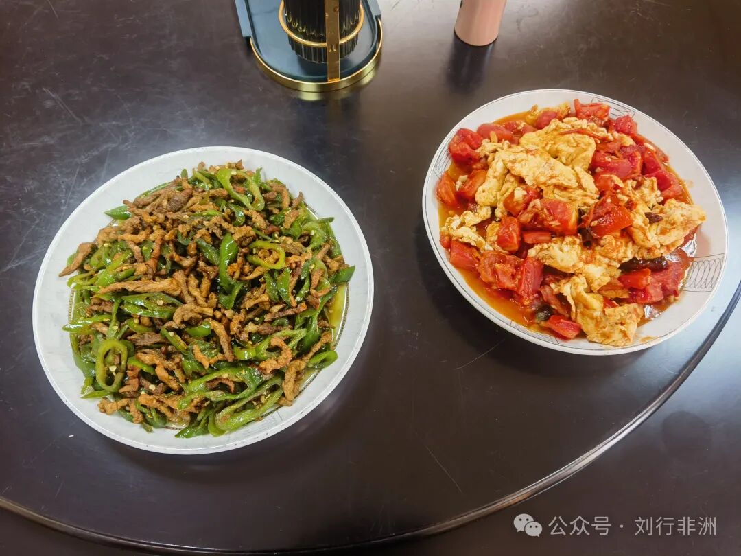 我去的时候比较晚了,孔总留我在修车厂吃饭。老板给饭吃,那我不能客气。这榨菜肉丝汤可是来非洲第一次喝。青椒肉丝也很赞。