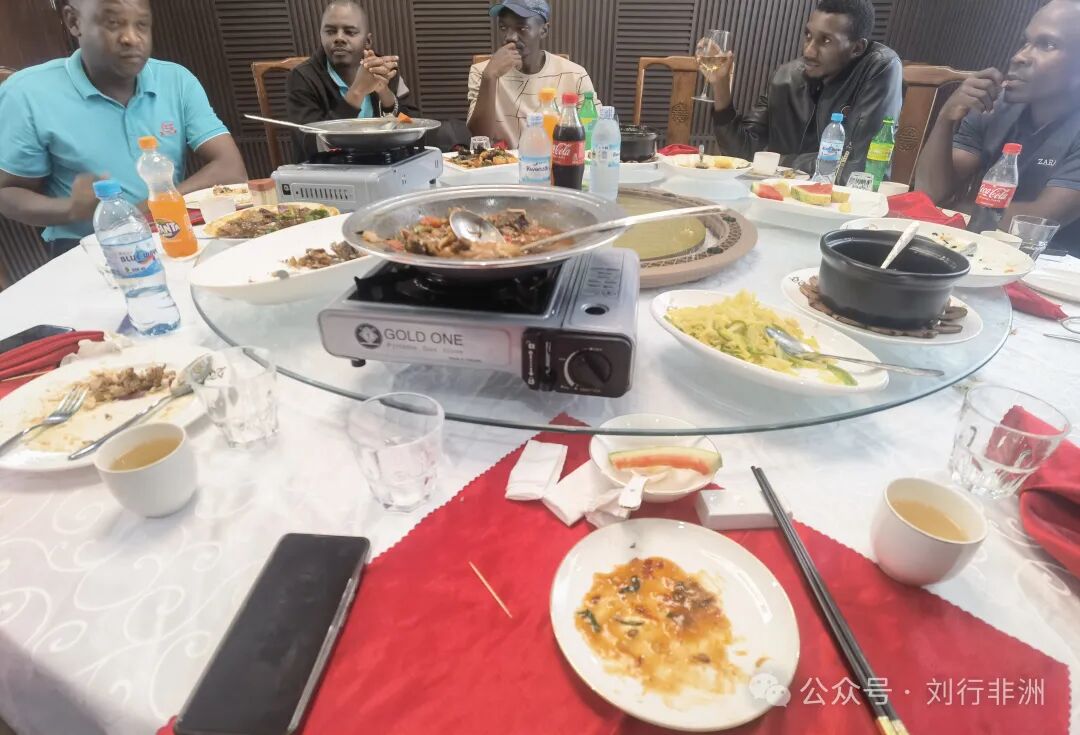 于是去干饭。非洲大汉们肚肠颇大,一桌饭轻松又干完。休息一会儿开干。第一家采访完,下大雨,又耽误一会儿。采访了几家工厂,一家比一家慢。