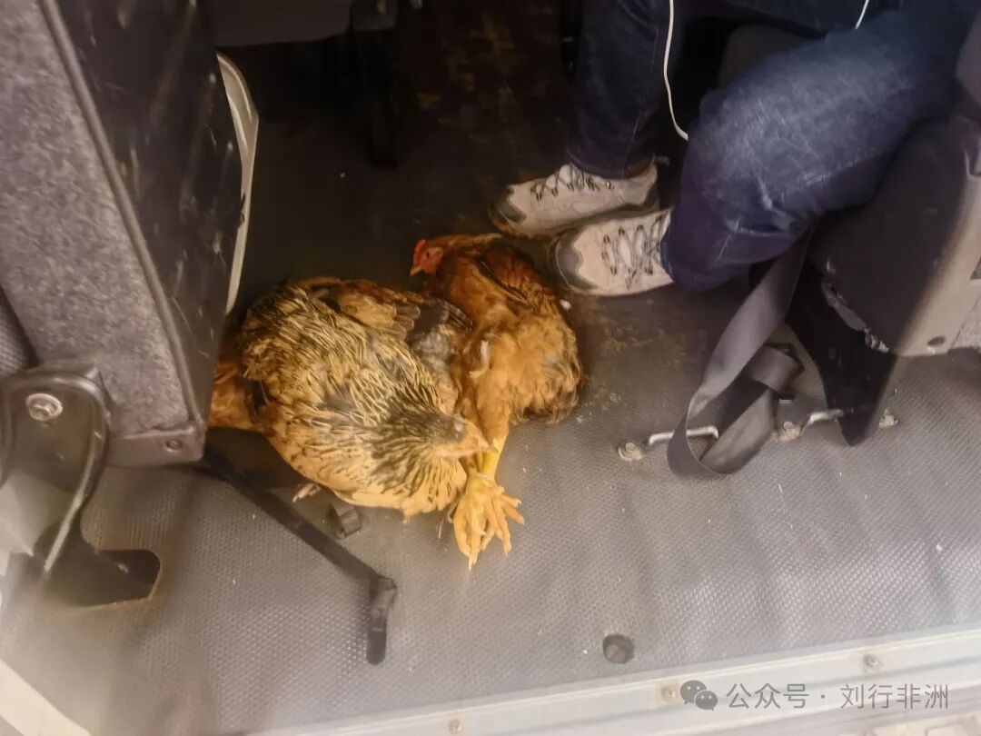 非洲小巴名不虚传,乘坐体验极差,窗户小,人多,座位高又硬,抬头碰车顶,还颠得厉害。脚底下还有鸡,不消说,咯咯叫。这不能怪别人,是我们的人买的。
