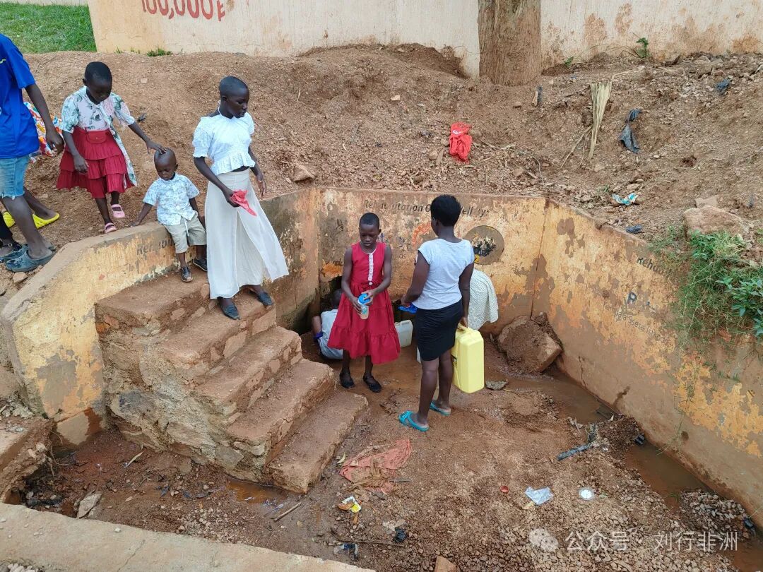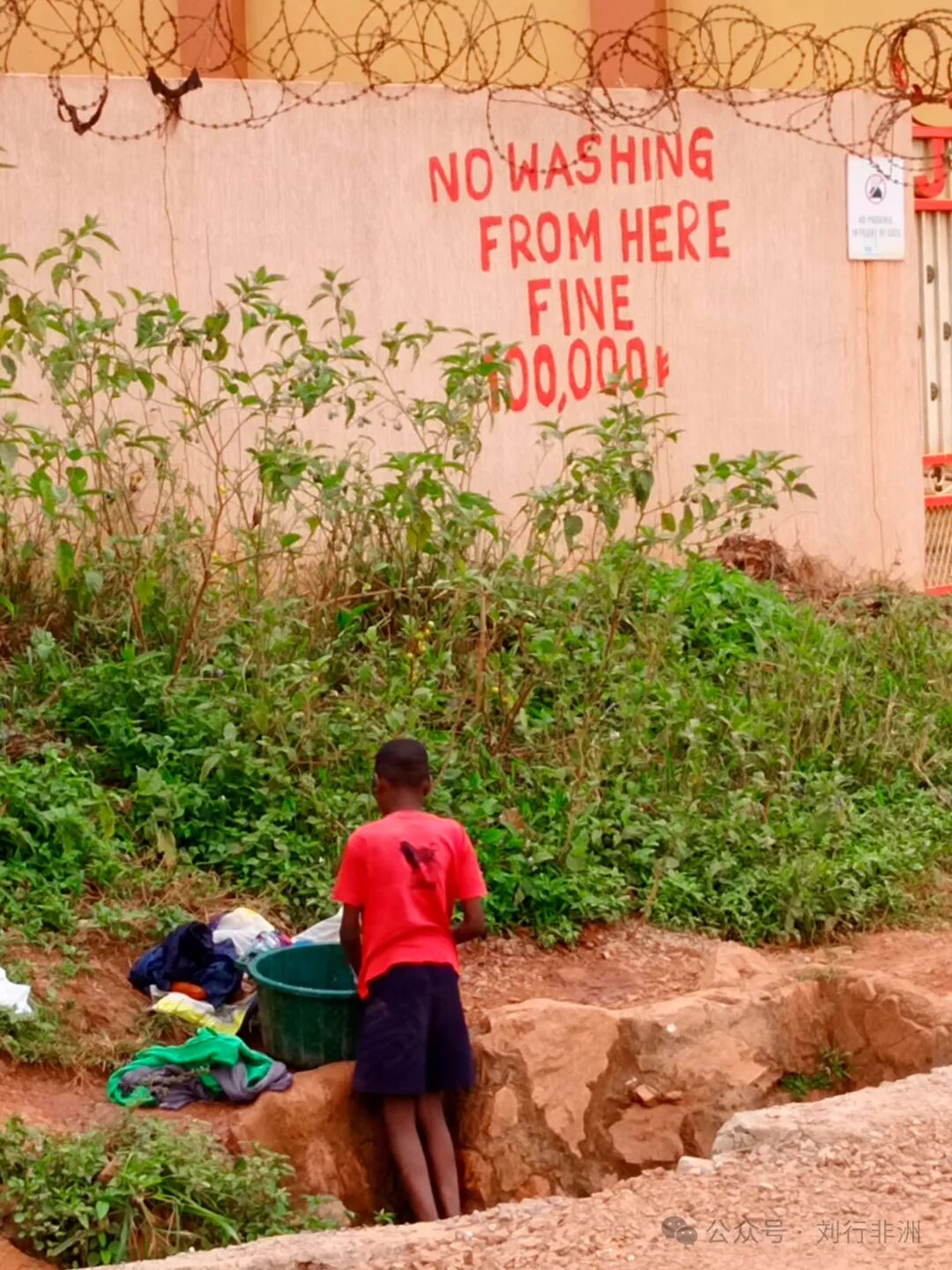 回来的路上,跟小黑孩聊天,路边墙上写着,在这儿洗衣服罚十万,然后有人在那里洗衣服。这是喝的水,有一群小黑孩在那里拿杯子接水喝。