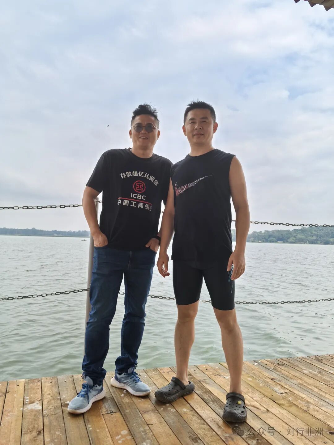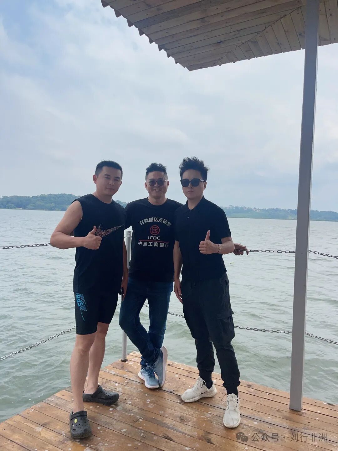这是亿元富翁和他的同事在湖边吹风。