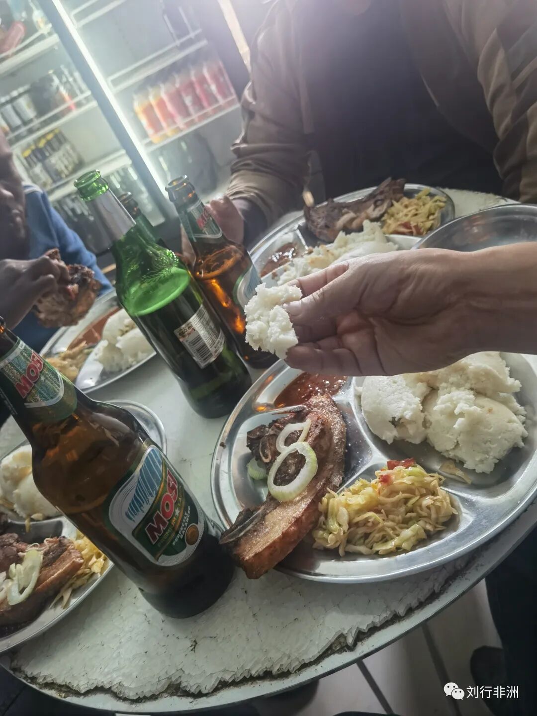 破餐桌上丢着一个不锈钢小盆,里面是板结的细盐,玻璃桌面呲牙咧嘴,但餐厅整体其实看着还不错,墙上挂着海信电视,不愧是非洲第一品牌!屋里的冰箱里满满都是饮料和啤酒。老板娘带我们进到里屋选菜,几个很现代的长方形不锈钢大餐盆,里面是鸡肉、牛肉、猪排,这是希玛的配菜。