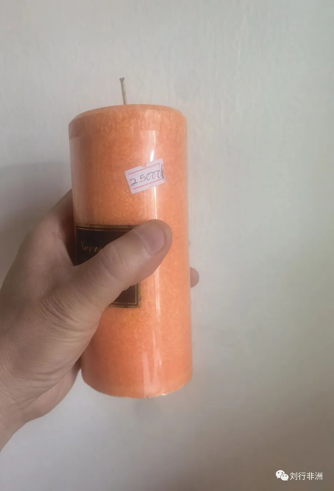 好家伙,到了超市一看,第一次见这么粗的蜡烛,有可乐罐大小。价钱也不便宜,25000先令,合人民币50,多少有点儿离谱。一个工人一月工资就买10根蜡烛?这什么物价!袜子一双20元人民币,也很离谱。怪不得非洲人全都打赤脚。国内来的橘子,一个六块。
