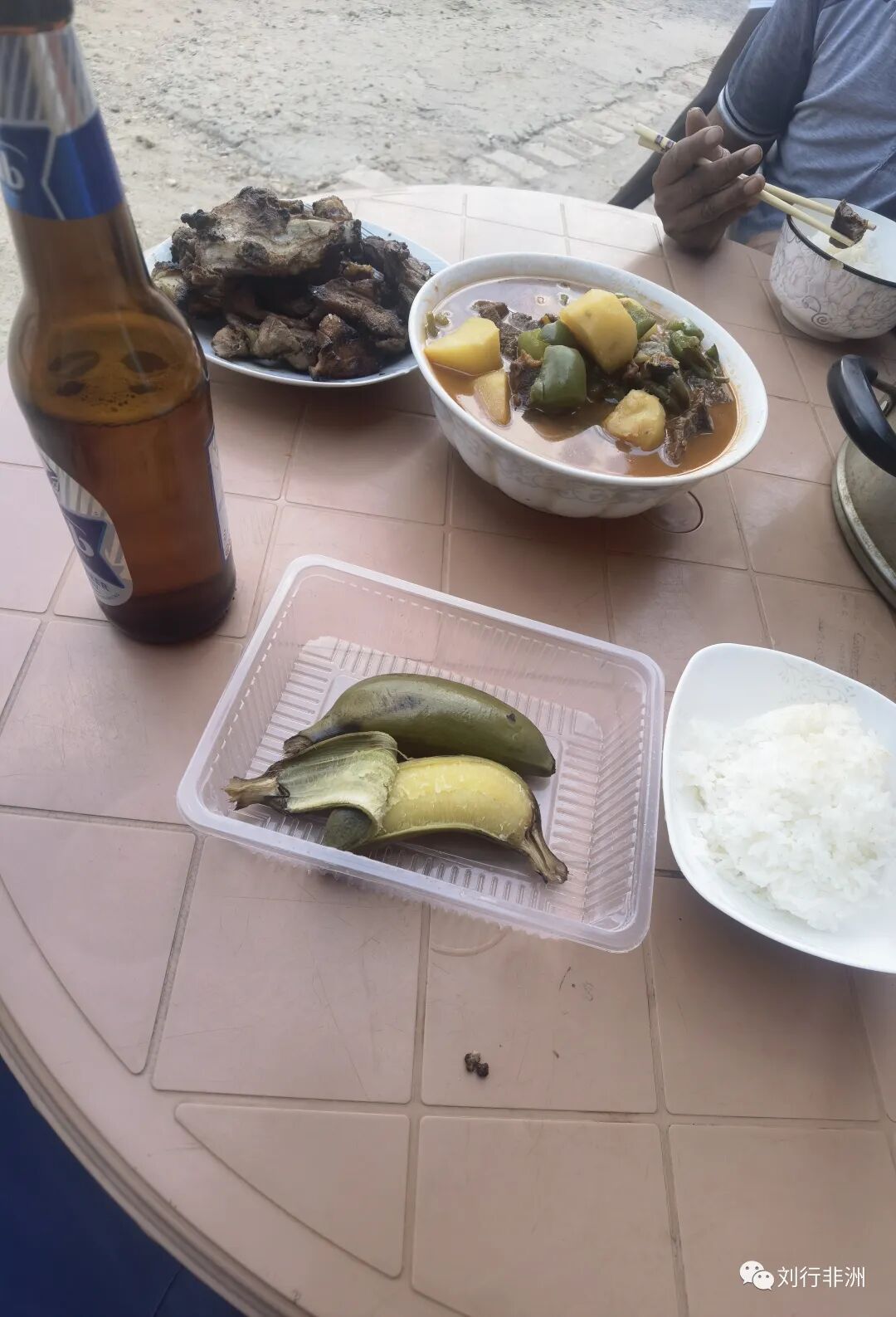 香蕉吃起来没味道,就像没有甜味的煮红薯,微微发酸,面嘟嘟的。这得蘸着肉汤吃才行。我好像终于知道我坐埃航飞机来非洲的时候,那个没味道的飞机餐是什么了!
