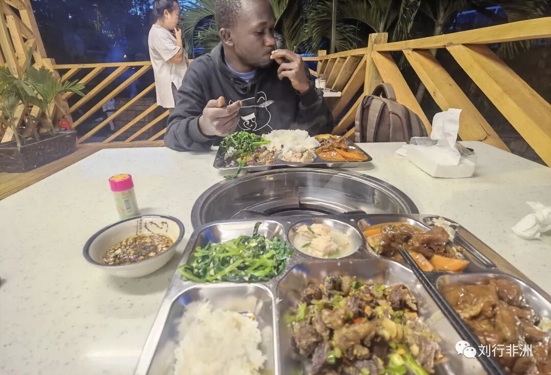 傍晚时候,到了饭点。黑人女服务员站在楼下用三种语言喊客人吃饭,她双手做喇叭状放在嘴边,先是中文:“吃饭了!吃饭了!”然后是斯瓦希里语:“伽古伽古!”然后是英语:“time to supper”连起来就是:“吃饭了,吃饭了!伽古伽古!time to supper~~”连喊三遍结束。