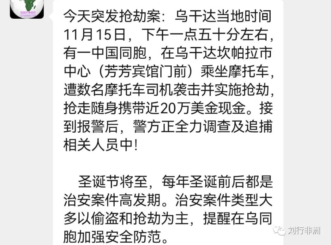 两个同胞在坎帕拉被抢就损失更大,一个被抢了两个亿先令,40万人民币。另一个更狠,20万美元。都是大白天抢劫。