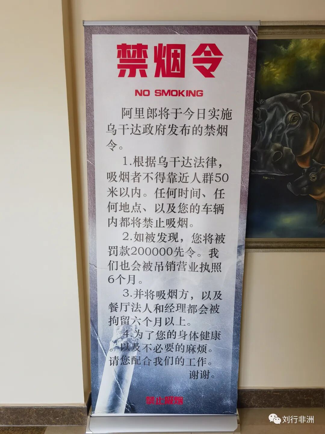 那天,我去首都坎帕拉办事,在酒店里看到了一则触目惊心的禁烟法律:抽烟要在人群50米开外,所有公共场所,包括私家车内,都禁烟。在餐厅逮住抽烟的,罚款400人民币,拘留6个月。