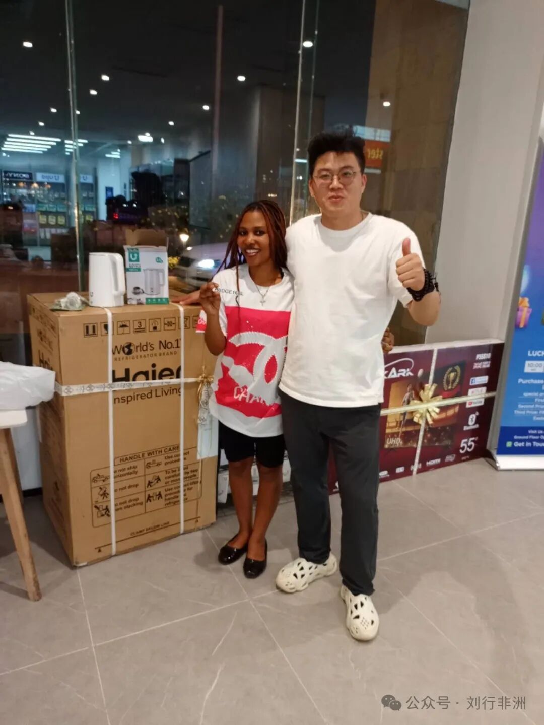 所以,这个非洲姑娘在我促销第二天就抓到了大奖,一台海尔冰箱。