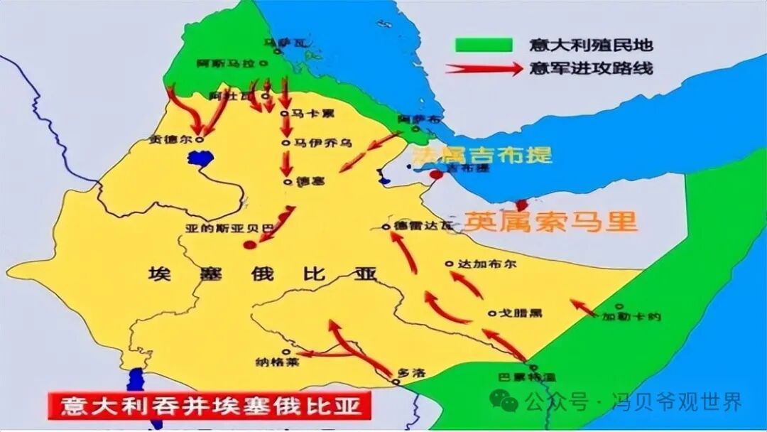 5. 意大利殖民时期:1889年,意大利同绍阿国王签订《乌西阿利条约》,1890年,意将占领区命名为“厄立特里亚”。1896年,埃塞俄比亚大败意军,意被迫承认埃塞俄比亚独立。