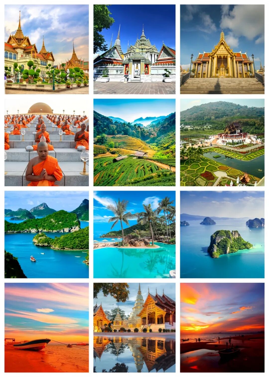泰国有许多著名的景点,包括曼谷的大皇宫和泰国国家博物馆,清迈的古城和寺庙,普吉岛的美丽海滩等。此外,还有世界著名的湄南河上的城市——曼谷,是游客必去之处。
