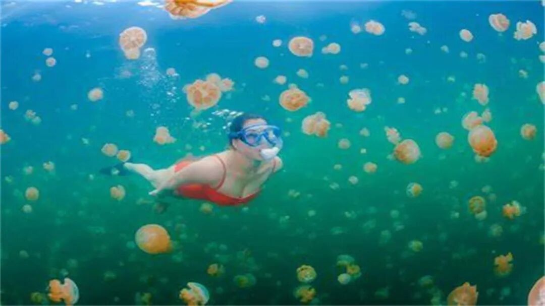 帕劳的 Jellyfish Lake 是世界上罕见的无毒水母湖,湖中金色水母数量庞大且不具毒性,游客可以在此畅游,与水母共舞,体验人与自然和谐共生的独特奇观。