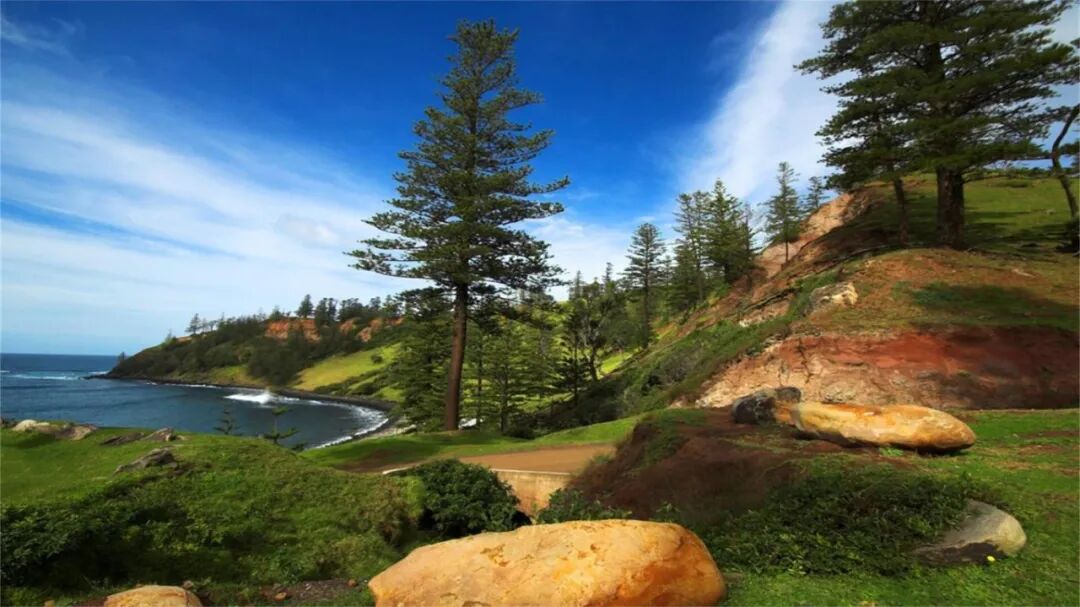 诺福克群岛,位于南太平洋深处,距离澳大利亚大陆东岸约1,400公里,犹如远离尘嚣的一片净土。这里的天空湛蓝如洗,海水碧波荡漾,阳光洒下,勾勒出一幅光影斑驳的海天画卷。岛上标志性植物——诺福克岛松,挺拔屹立,绿意盎然,为这片海域增添了几分宁静与庄重。