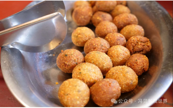 7.黎巴嫩炸豆丸:黎巴嫩炸豆丸是将鷹嘴豆泥裹上麵包屑油炸而成,外酥里嫩,口感丰富,是黎巴嫩人喜爱的零食和开胃菜。
