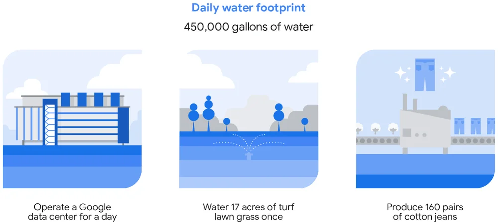 谷歌在其官网公布,2021年,谷歌数据中心平均每天消耗约45万加仑水。这大约相当于灌溉17英亩草坪一次的水量,或者种植用于生产160条牛仔裤的棉花的水量。