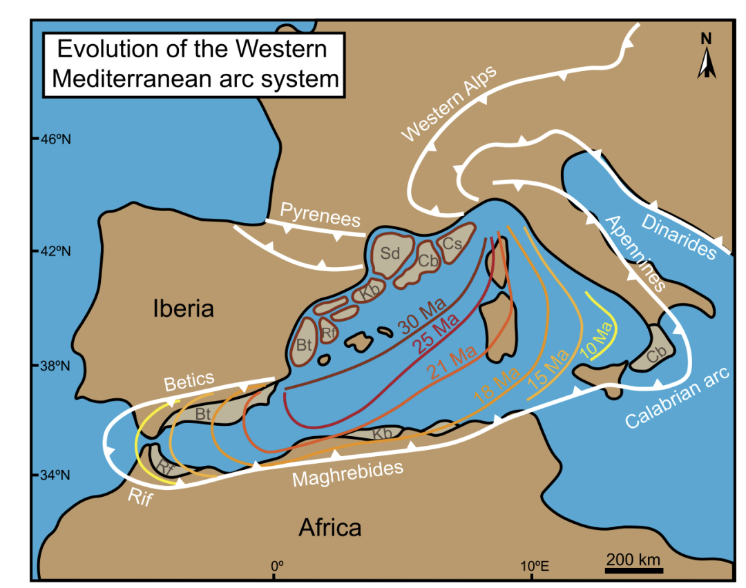 图1.西地中海的演变,彩色轮廓线代表了从30 Ma到今天西地中海海沟位置的演变。红色轮廓多边形显示了大陆块的初始位置。