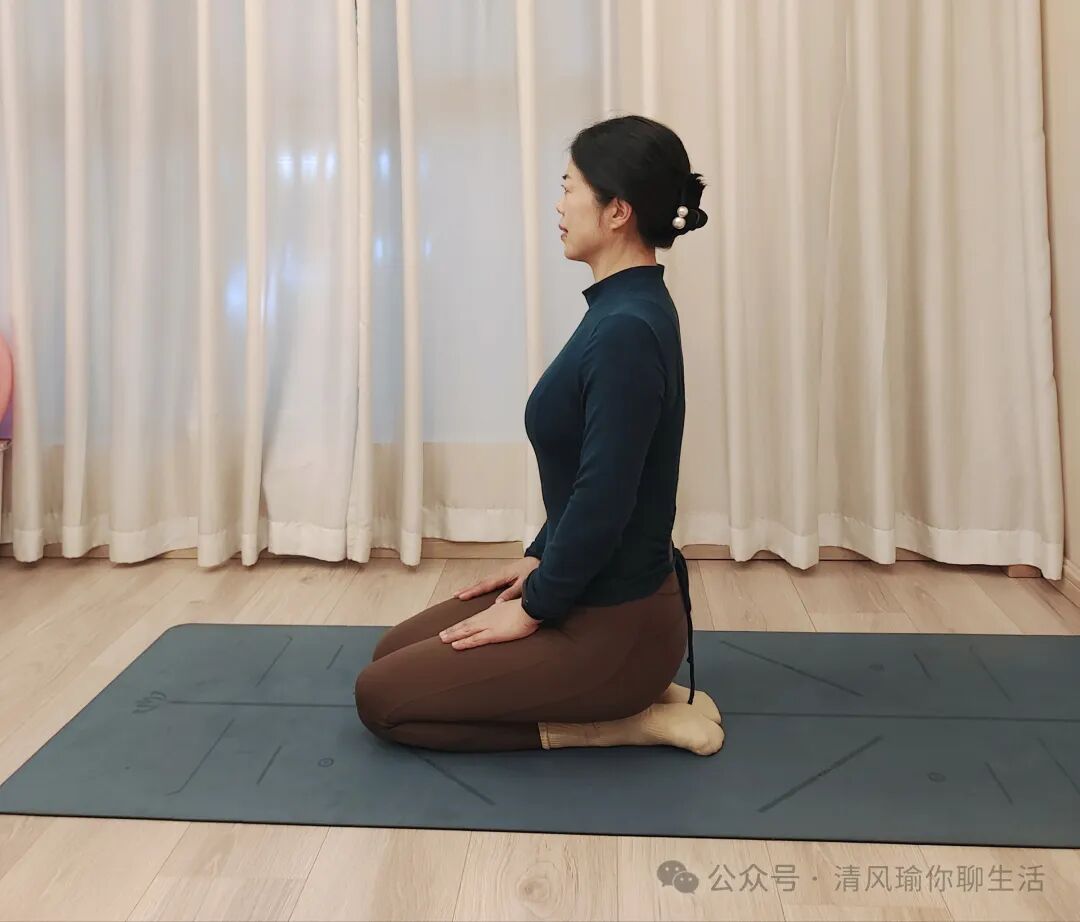 双膝并拢跪在垫子上,让你的脚背平贴在垫子上,大脚趾并拢。脚的十个脚趾都往你臀部的后方去做延伸,坐骨坐在脚后跟上。尾骨向下勾,收腹部,脊柱胸腔向上去延展,转肩向后,头部向上延展,后脑勺微微的向后去靠,双手放在大腿上。
