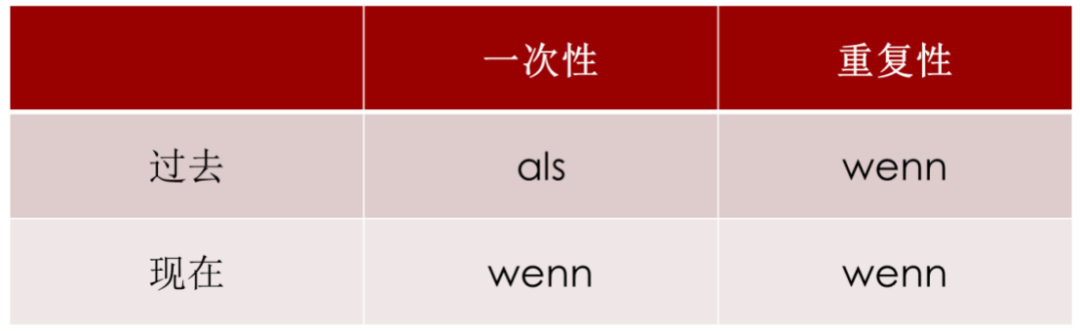 首先来看一下表示“当...时”的两种表达方法,wenn和als。 二者的区别我们只需要记住一句话,als表示过去一次性发生的事。详细见下表: