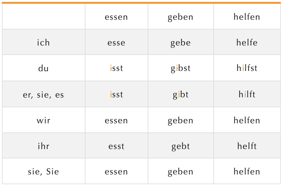例词:essen(吃)、geben(给)、 helfen(帮助)
