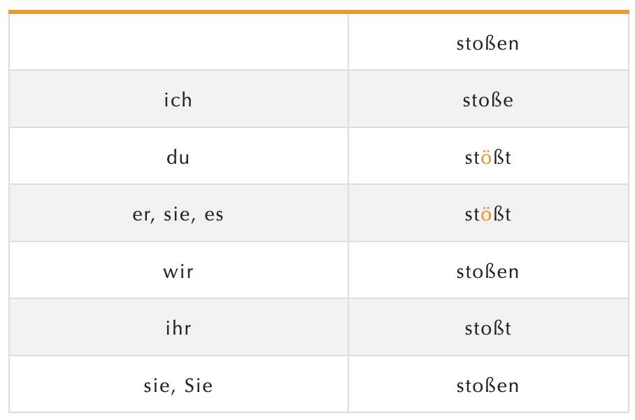 从上面总结的表格可以看出,发生变音和换音的地方集中在du和er/sie/es两个人称,所以在造句时我们也可以有意识第用这两个人称作为主语。