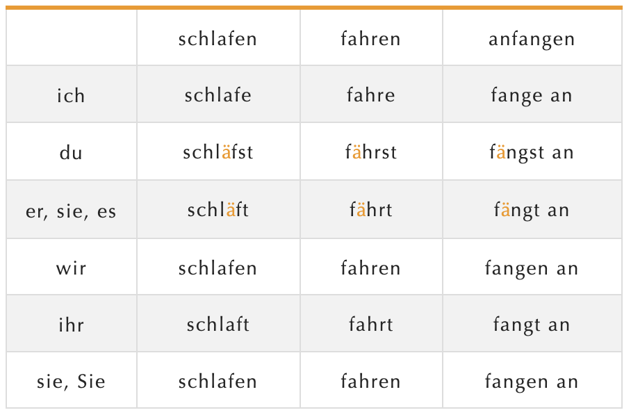 例词:schlafen(睡觉)、fahren(驾驶)、anfangen(开始)