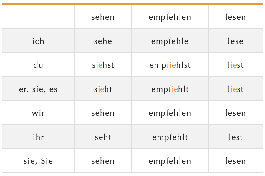 例词:sehen(看)、empfehlen(推荐)、lesen(读)