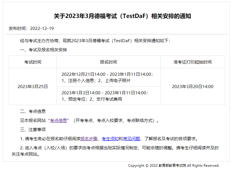 11月19日(昨日),德福考试院官网公布《关于2023年3月德福考试(TestDaF)相关安排的通知》, 详见下表: