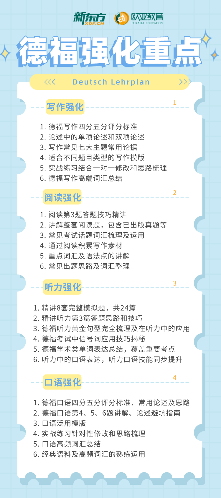 我们会使用到外研社出版的《德福考试高分突破》这本真题集,此外还包括新东方德福基础强化班内部专用讲义。