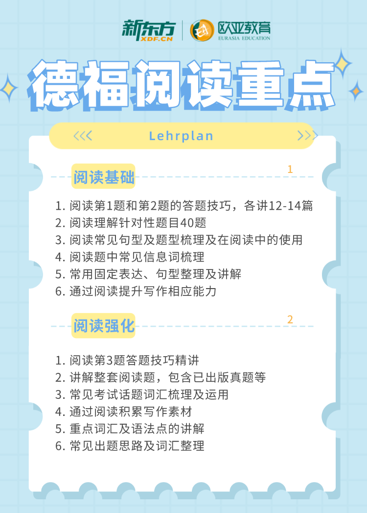 德福强化班主要讲解5分题(Aufgabe 3),同时以德福考试的整套题目题型为基础,每次阅读课程平均讲解两套德福题型(共包含6篇阅读),通过大量的做题从而做到熟悉题型以及提升正确率。