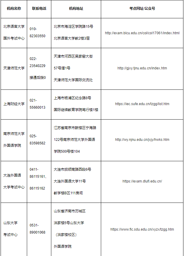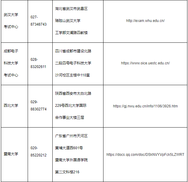 本次考试共在十个城市设有考点:北京、天津、上海、南京、大连、济南、武汉、成都、西安、广州。