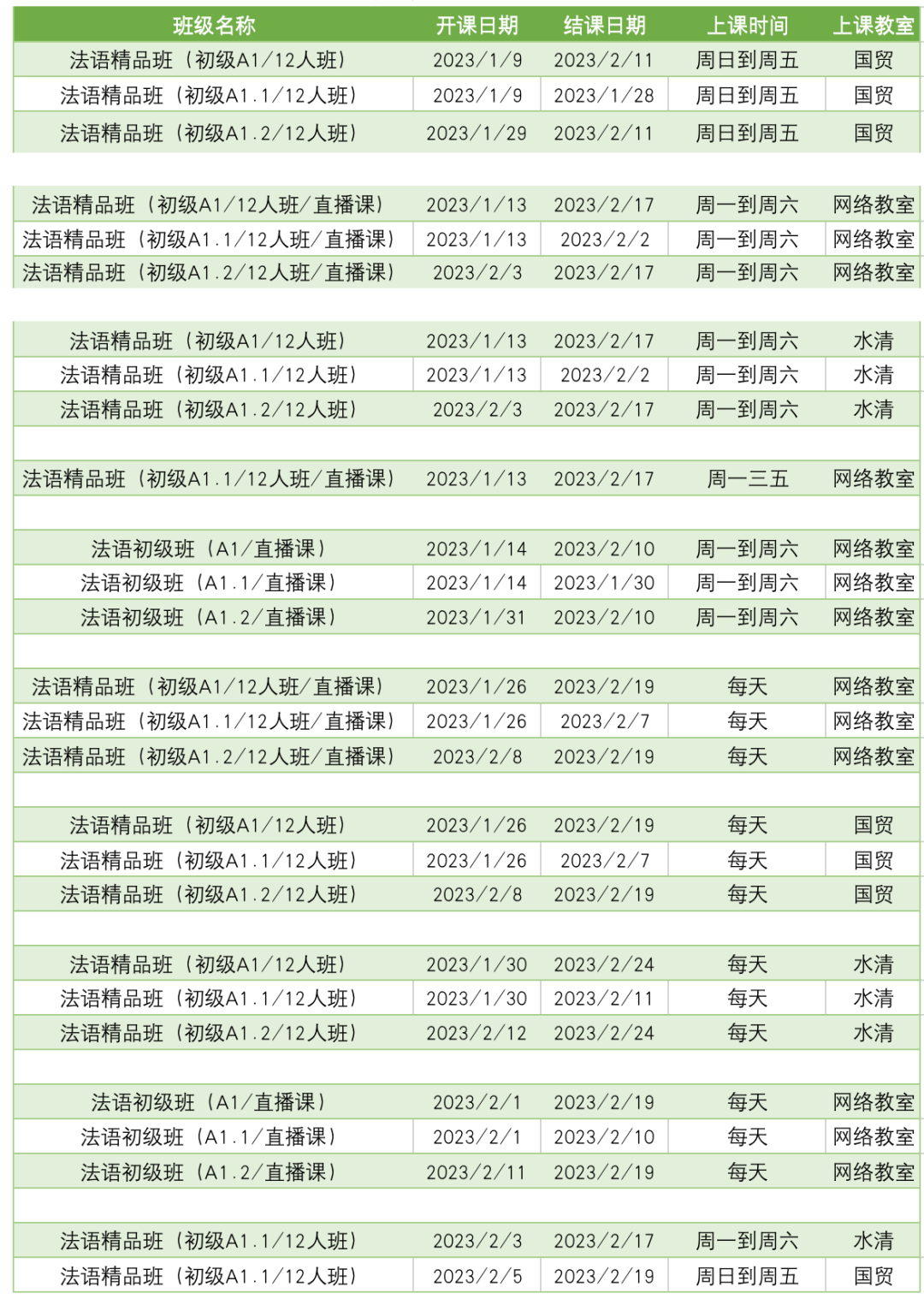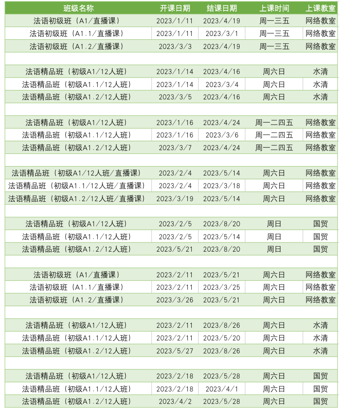 更多法语A1课程排期及优惠