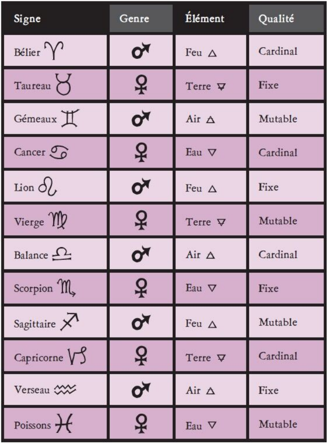 另外,这些形象符号还被分为四种元素,并按以下顺序排列:火 (Feu),土 (Terre),风 (Air),水 (Eau);三种特质:基本宫(cardinal),固定宫(fixe),变动宫(mutable),以此来说明该星座是开创,停留还是离开某个季节。