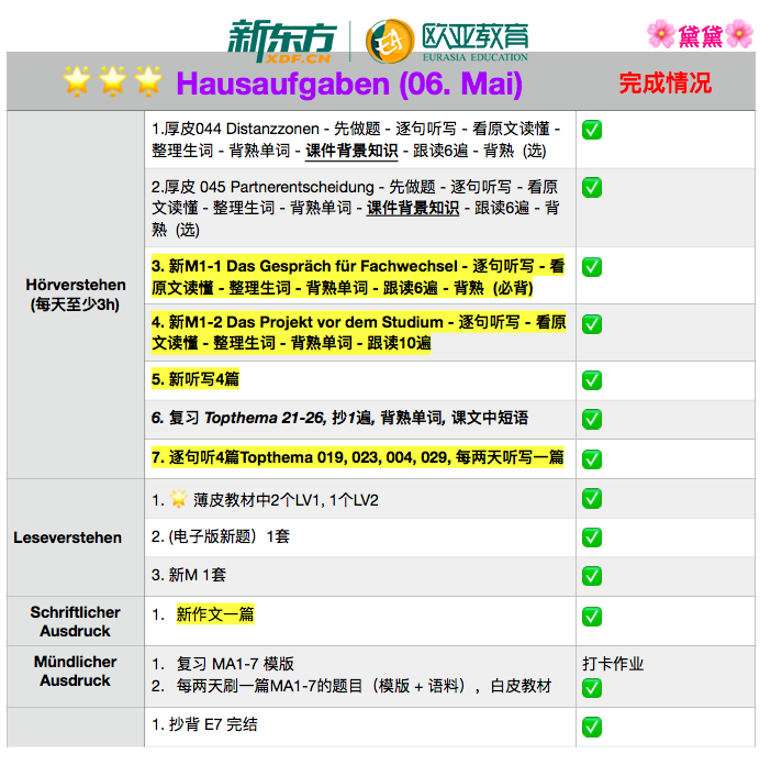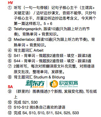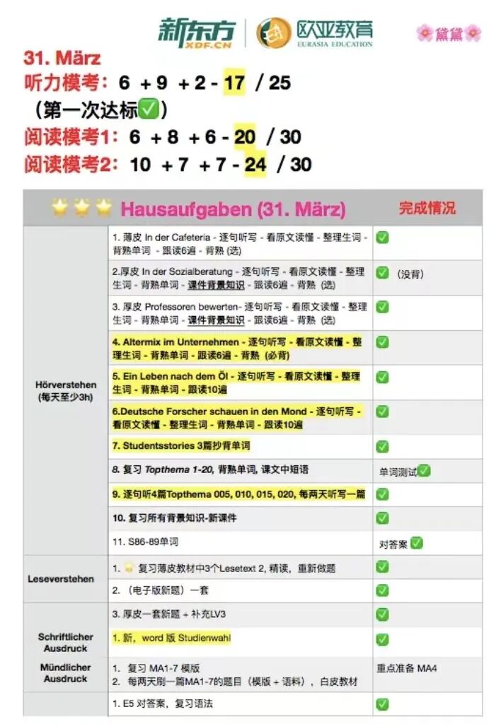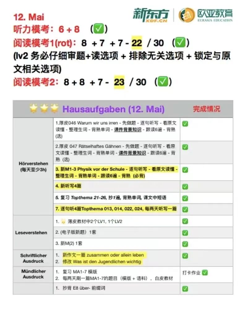 ● 学习计划要细化每天的任务量,例如:一个主题的词汇+听写2篇+复盘一套旧的听力题目+做一套新的听力题目+背5个背景知识点+选1篇相似主题文章作段落Zusammenfassung 等。
