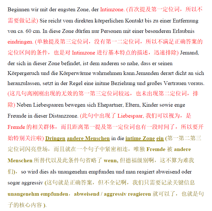 首先我们解读题目(不是翻译的方式),题目中出现了几个关键的定位词, Intimzone 第一定位词,Fremde 第二定位词,ein(dringen)第三定位词,注意此处一二三不是指顺序,而是重要性。