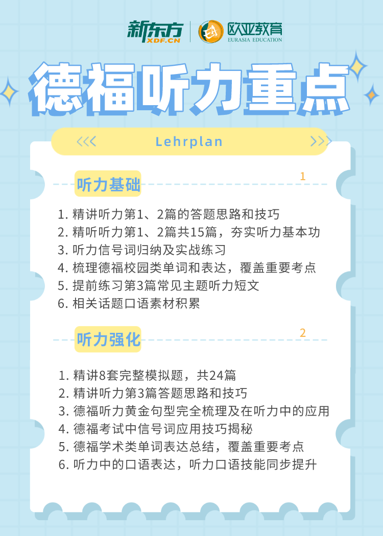 听力项薄弱的原因涉及到很多方面,如德福词汇量不达标,读不懂题(不知道题目的深层内涵,只是会敷衍的读题画画定位词), 总是跟不上听力节奏,只知道答案的大致位置却不知如何下笔写等等,认真做好分析再做训练计划,会有很不错的效果。