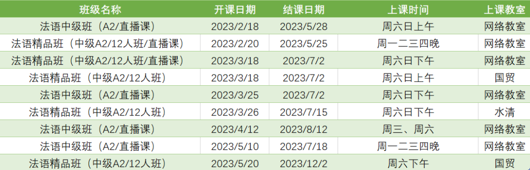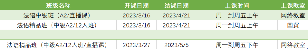 更多法语A2周末课程排期及优惠