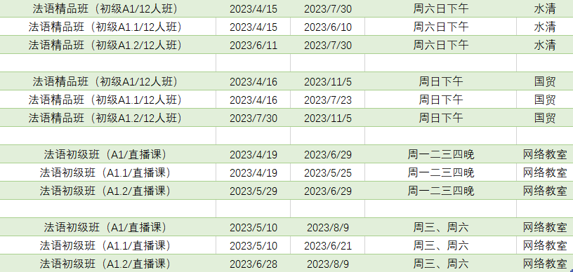 更多法语A1周末课程排期及优惠