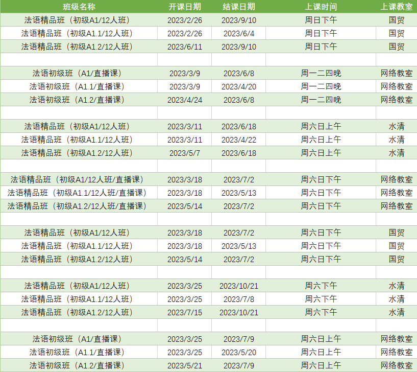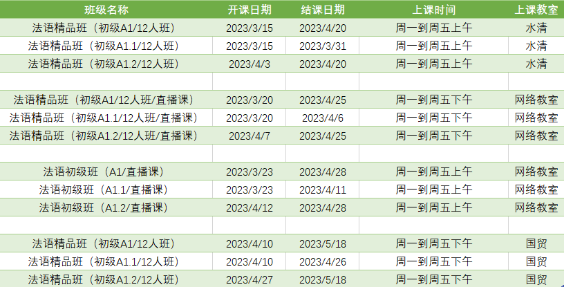 更多法语A1平时课程排期及优惠