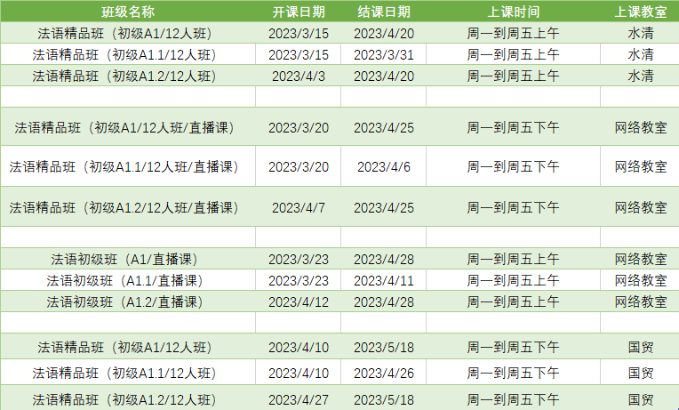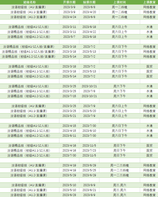 更多法语A1课程排期及优惠